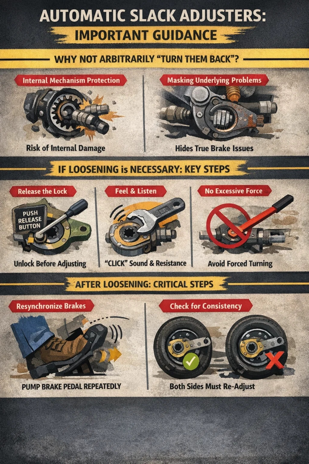 ↳ Menyamarkan masalah asas: Jika kelegaan tidak betul, ia biasanya disebabkan oleh kehausan atau kerosakan pam brek, aci sesondol atau komponen transmisi lain. Melonggarkannya secara manual hanya merawat simptom, bukan punca, dan bahaya keselamatan sebenar kekal.