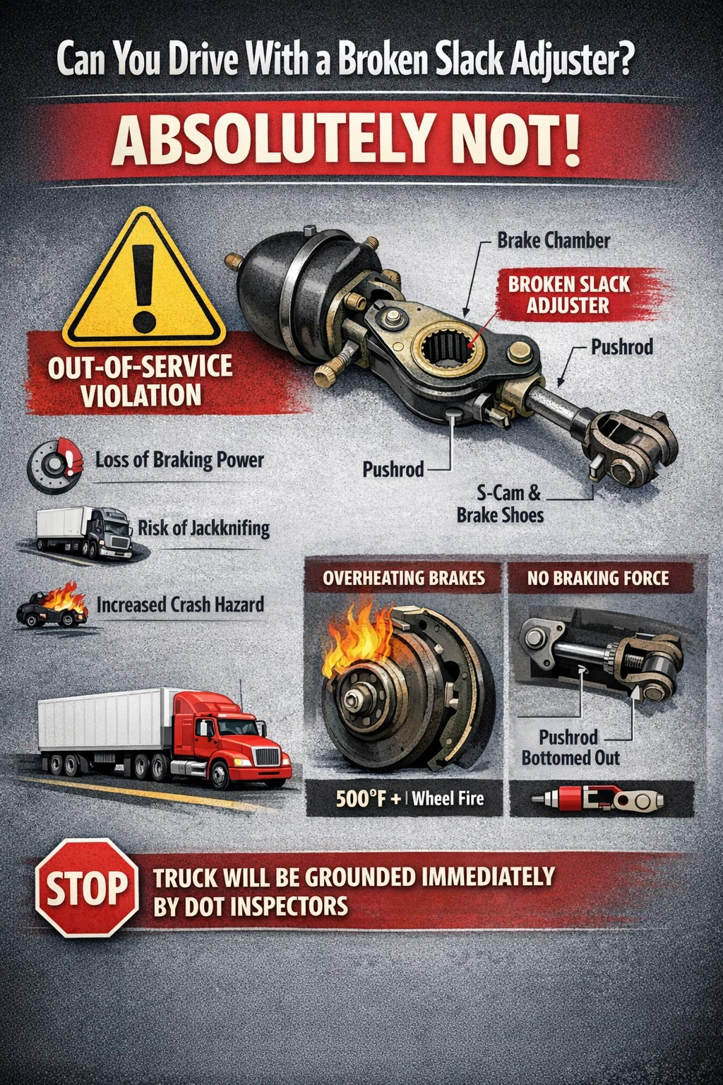 Jawapan ringkasnya ialah sama sekali tidak. Anda tidak boleh memandu kenderaan komersial secara sah atau selamat dengan pelaras kendur yang rosak, tidak berfungsi atau tidak dilaraskan dengan betul. Di mata Jabatan Pengangkutan (DOT) dan pemeriksa keselamatan, patah pelaras kendur adalah pelanggaran "luar perkhidmatan". Jika anda ditangkap mengendalikan kenderaan dengan kecacatan ini, trak anda akan dibumikan serta-merta di tapak pemeriksaan.