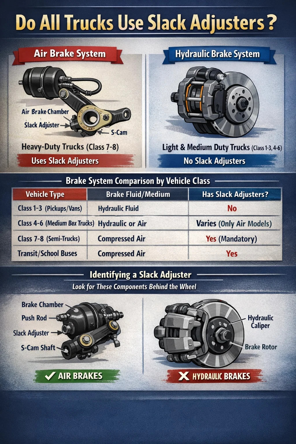 Menariknya, walaupun moden brek cakera udara (yang menjadi popular pada trak Kelas 8) mempunyai mekanisme dalaman yang melaksanakan fungsi "pelarasan kendur", tetapi mereka tidak mempunyai "lengan" luaran tradisional yang biasa dilihat dan diperiksa oleh pemandu semasa pemeriksaan pra-perjalanan CDL.