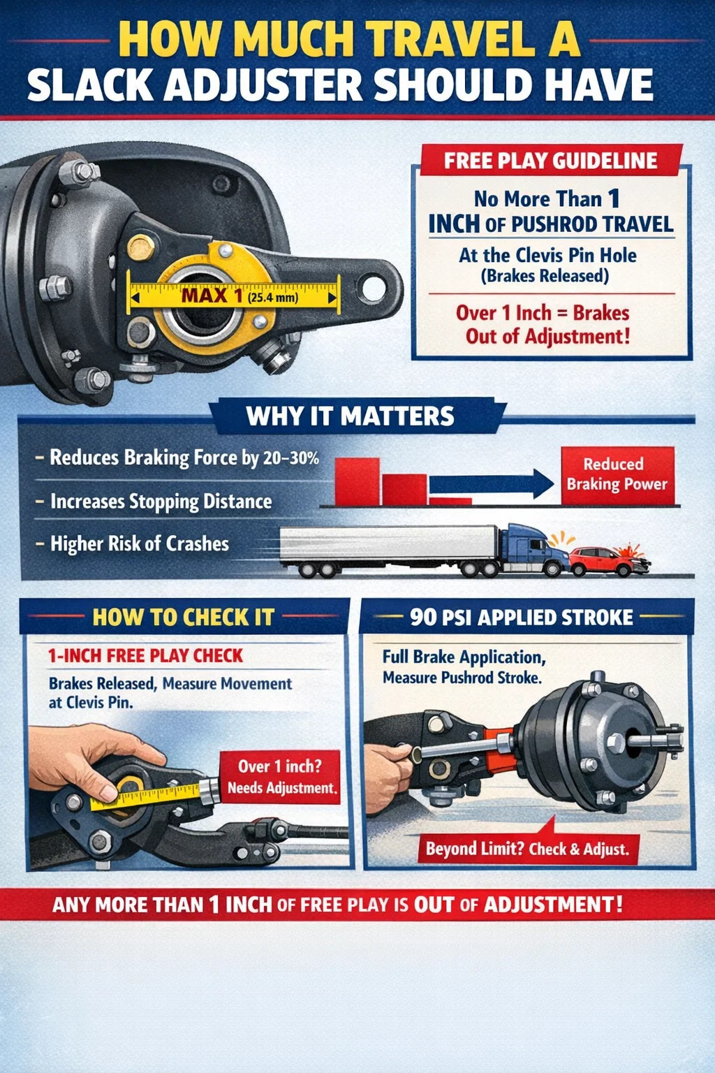 Jika lejang tolak melebihi had undang-undang semasa penggunaan brek, kenderaan itu dianggap tidak berfungsi. Had yang tepat bergantung pada jenis dan saiz ruang brek, tetapi 1 inci permainan percuma pada pin clevis ialah ukuran medan yang diterima secara meluas yang menunjukkan pelarasan yang betul. Mana-mana pelaras kendur yang menunjukkan lebih daripada 1 inci perjalanan pada ketika itu memerlukan perhatian segera.