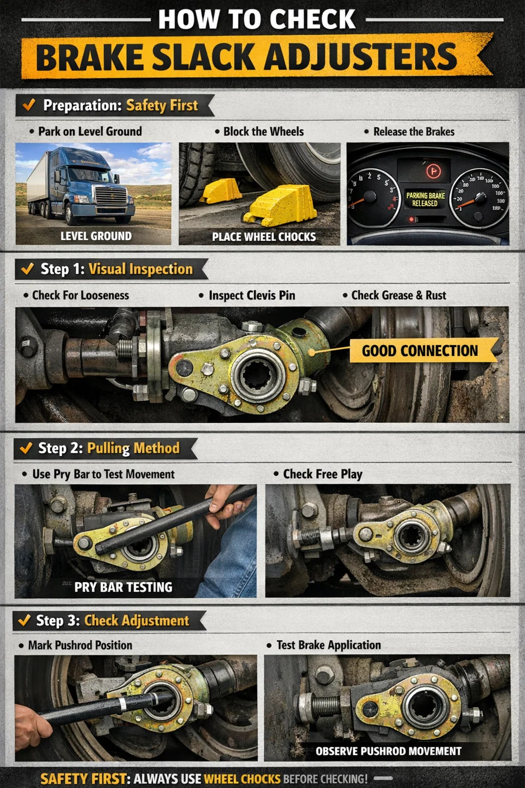 Sebelum merangkak di bawah trak, anda mesti mengambil langkah berjaga-jaga keselamatan, kerana anda perlu melepaskan brek untuk melakukan pemeriksaan.