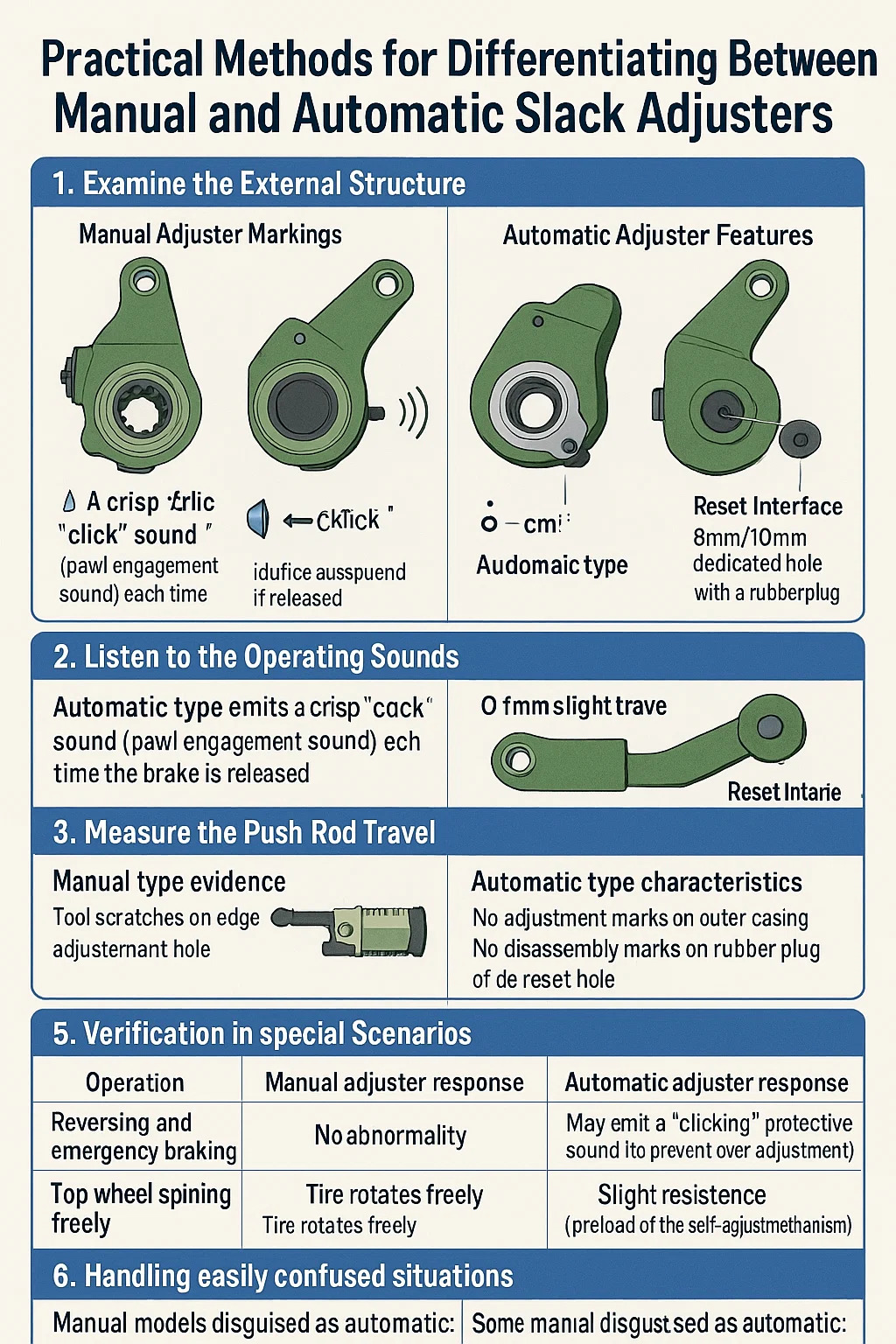 Jenis manual menunjukkan perubahan yang ketara: selepas 30,000 kilometer, anjakan rod push meningkat dengan ketara apabila brek (pelarasan diperlukan jika melebihi 40mm). Jenis automatik mengekalkan perjalanan berterusan: strok rod push tetap konsisten selepas dipakai (perubahan ≤5mm dalam kehidupan reka bentuk).