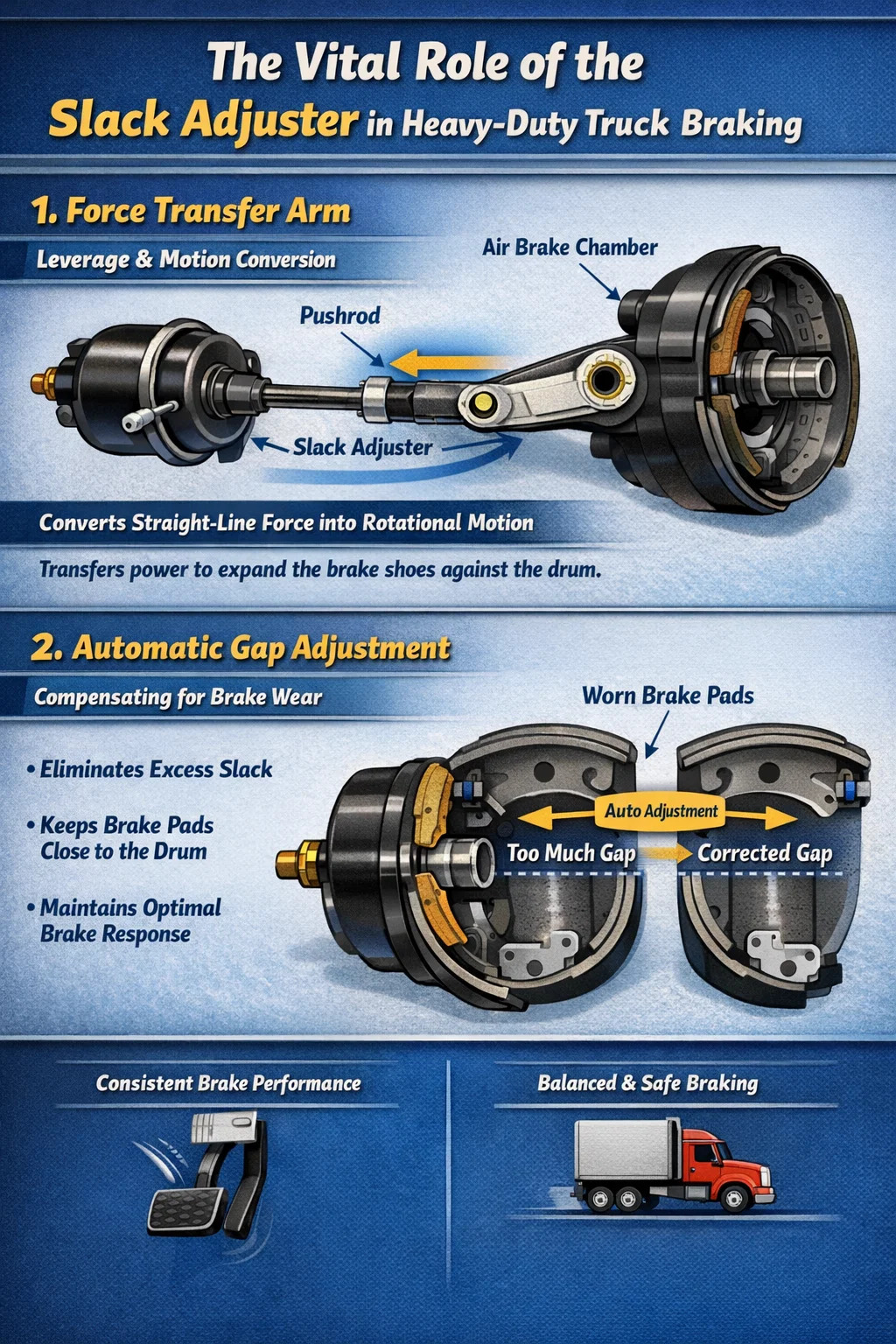 Slack adjusters play two crucial roles in the braking system of heavy-duty trucks. If the braking system were an arm, this component would be both the "joint" and the "precision engineer."